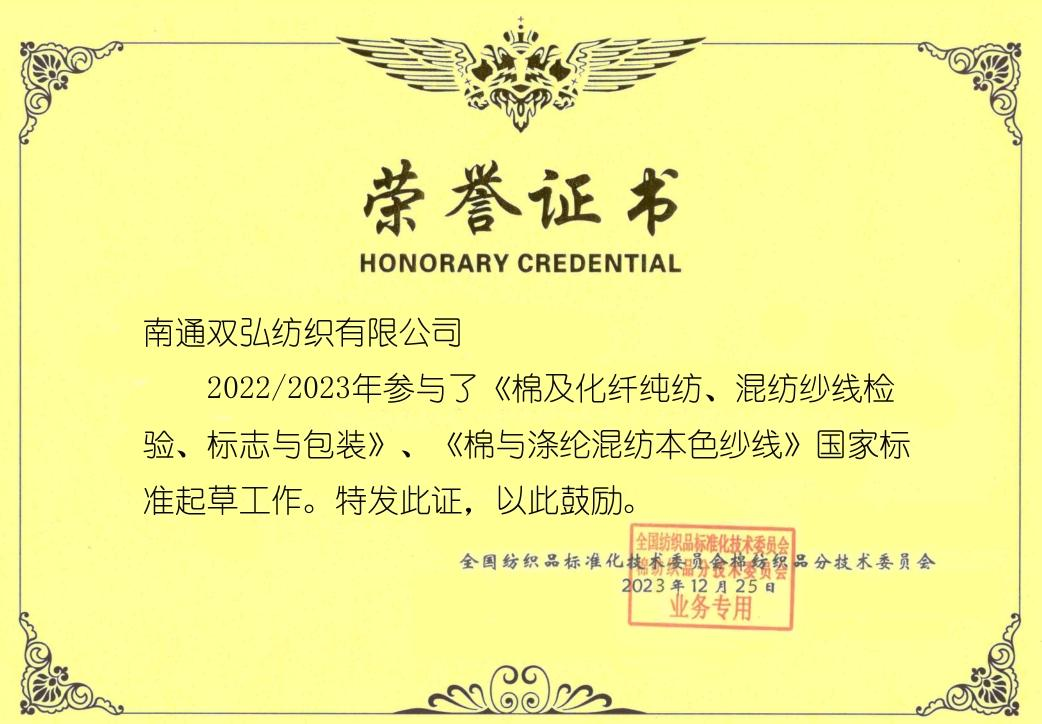 সুতির টেক্সটাইলের মানীকরণের জন্য জাতীয় প্রযুক্তিগত কমিটির ডেপুটি সেক্রেটারি-জেনারেল ইউনিট হিসাবে এবং চীন জাতীয় টেক্সটাইল এবং পোশাক কাউন্সিলের মানকতার জন্য প্রযুক্তিগত কমিটির একটি সদস্য ইউনিট, ডাবল দুর্দান্ত সংস্থা সক্রিয়ভাবে মানককরণ ক্রিয়াকলাপগুলিতে অংশ নেয়, এর গঠন এবং পুনর্বিবেচনায় অংশ নেয় বিভিন্ন মান, উদ্যোগ গ্রহণ করে মানদণ্ডের খসড়া এবং পর্যালোচনা গ্রহণ করা এবং অনেক মূল্যবান মতামত এগিয়ে দেয়। কিছু উদ্ভাবনী পরামর্শ গৃহীত হয়েছে এবং দৃ ified ় হয়েছে, স্ট্যান্ডার্ড খসড়াটির মাস্টার সংস্করণ হয়ে উঠেছে। ডাবল দুর্দান্ত সংস্থা has successively 3 টি জাতীয় মান, 11 শিল্পের মান, 4 টি গ্রুপ স্ট্যান্ডার্ড এবং তৈরি করা হয়েছে 3 কাস্টমস প্রসেসিং ট্রেড ইউনিট খরচ মান, এবং টেক্সটাইল শিল্পের মান এবং জাতীয় উন্নত ইউনিটের শিরোনাম জিতেছে টেক্সটাইল মানীকরণের ক্ষেত্রে অসামান্য অবদান সহ জাতীয় উদ্যোগ।